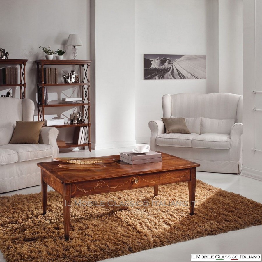 Dieser Couchtisch zeichnet sich wie alle Elemente der Kollektion durch die Verwendung von Intarsien und Dornen mit Edelhölzern aus, um Ihre Möbel harmonisch zu vervollständigen und eine einladende Atmosphäre zu schaffen. Die verschiedenen Holzdekore, Lackfarben, Bezugsstoffe und Polsterungen können ganz nach Ihren Wünschen ausgewählt werden.