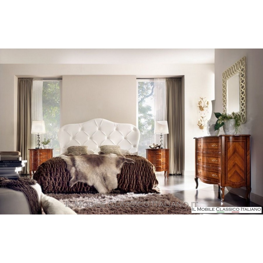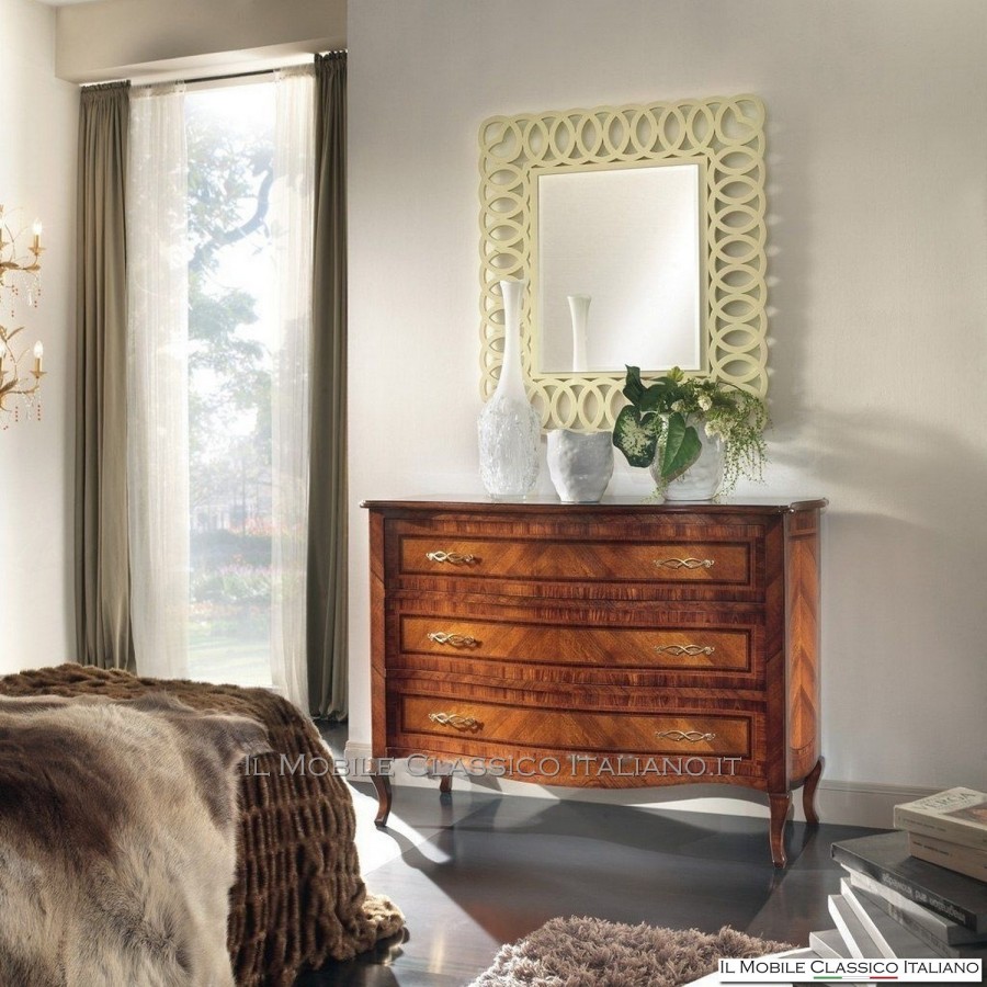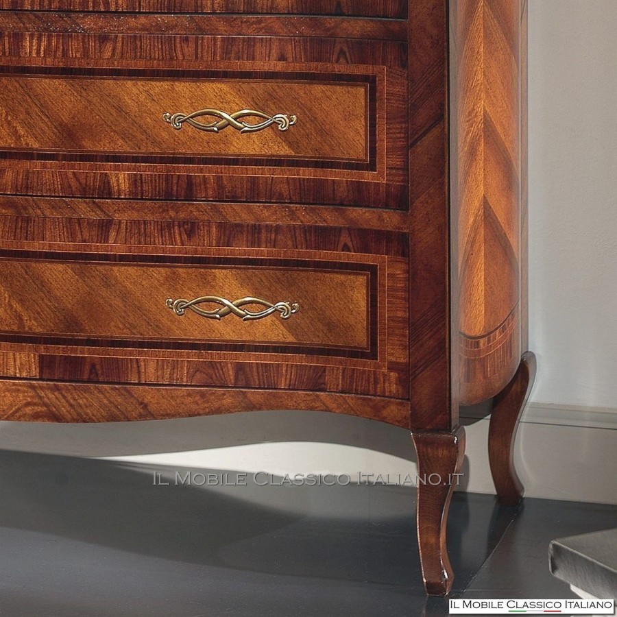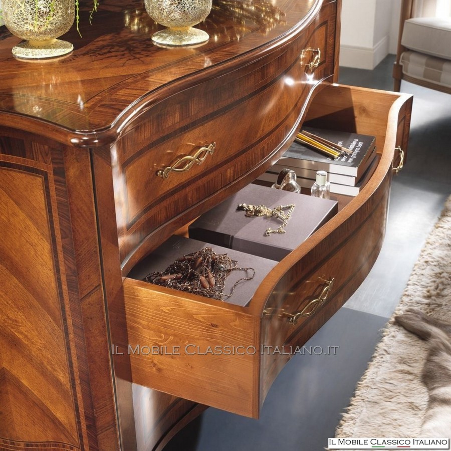 Diese geformte Kommode ist, wie alle Elemente der Dolce casa -Kollektion, eine Sammlung von Möbeln in verschiedenen Stilrichtungen , um Ihre Einrichtung harmonisch zu vervollständigen und eine warme und einladende Atmosphäre zu schaffen. Das Hauptmerkmal dieser klassischen Möbel ist die Komplexität der Konstruktion, tatsächlich sind viele dieser Möbel abgerundet, geformt oder geschnitzt. Sie haben Seiten mit Paneelen, die in eine oder zwei Richtungen gebogen sind. Auf die Oberflächen werden Intarsien aus seltenen und kostbaren Essenzen wie nationaler Nussbaum, Walnussfeder, Bois de Rose, Palisander, Ahorn, Olive, Bois de Violette, Zebrano- oder Eschenmaser, Eiche, Nussbaum, Myrte, persischer Nussbaum, Olive aufgebracht Baum. Die Verarbeitung dieser klassischen Möbel erfordert viel Geschick und Erfahrung.