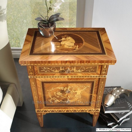 Preis 1.627,52 €Paar Nachttische mit Engelintarsien, mit 3 Massivholzschubladen. Hergestellt in Italien.