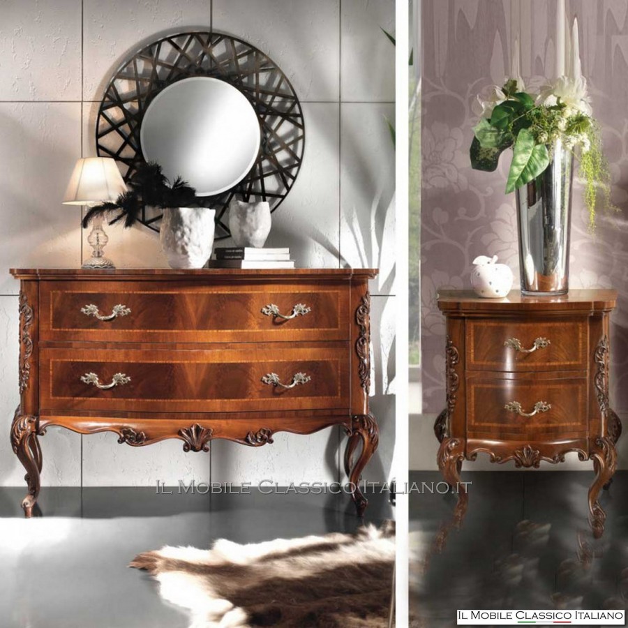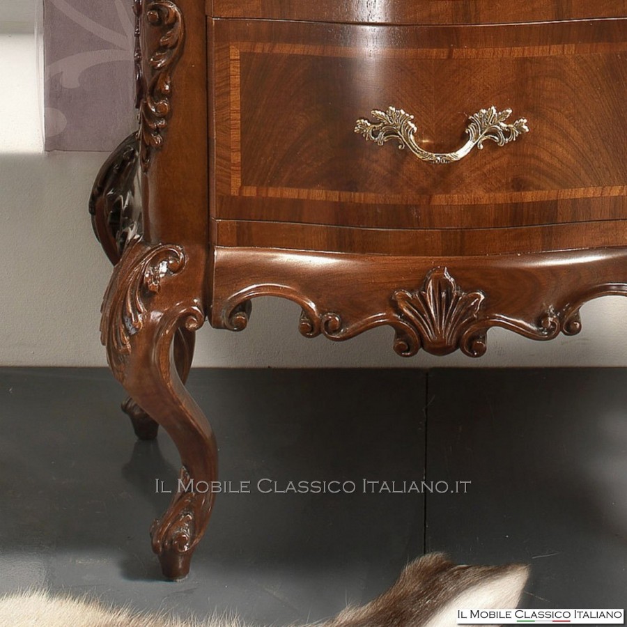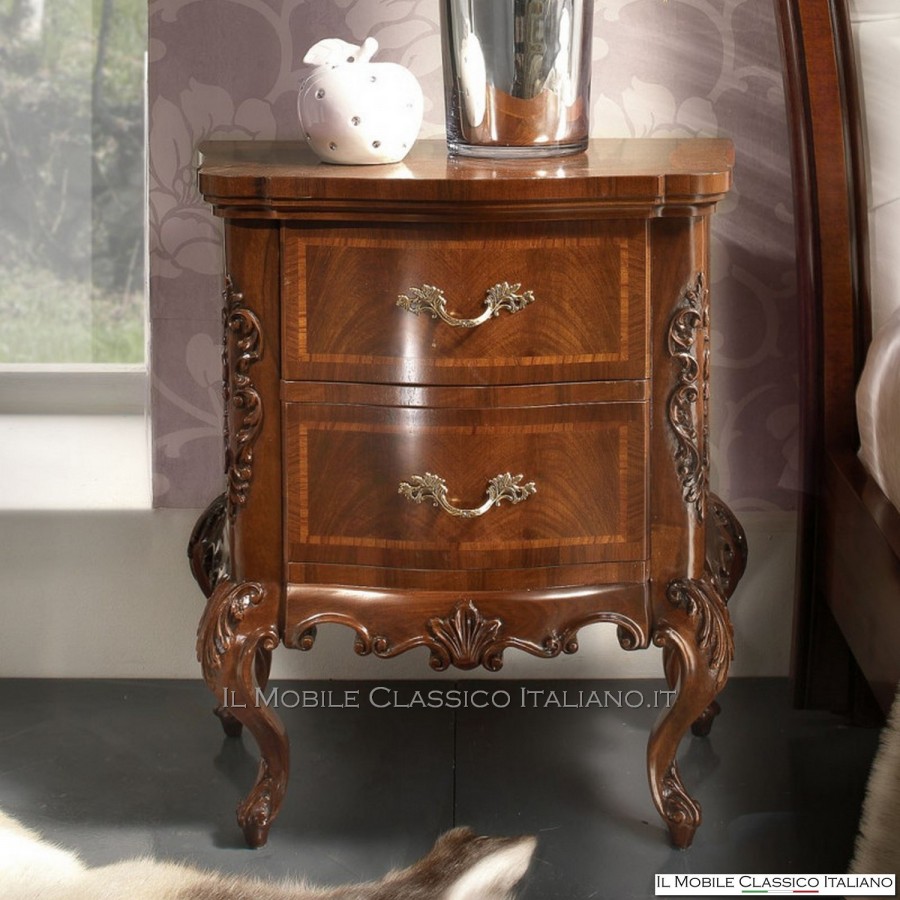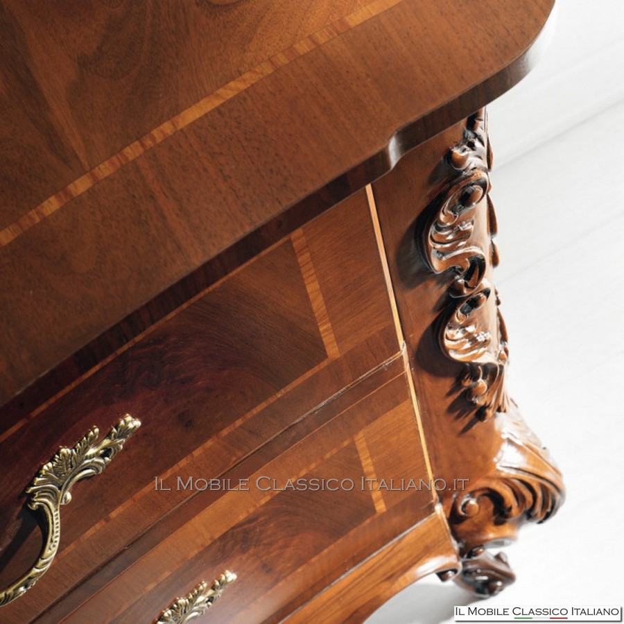 Dieser geschnitzte Nachttisch ist, wie alle Elemente der Dolce casa -Kollektion, eine Sammlung von Möbeln in verschiedenen Stilrichtungen , um Ihre Einrichtung harmonisch zu vervollständigen und eine warme und einladende Atmosphäre zu schaffen. Das Hauptmerkmal dieser klassischen Möbel ist die Komplexität der Konstruktion, tatsächlich sind viele dieser Möbel abgerundet, geformt oder geschnitzt. Sie haben Seiten mit Paneelen, die in eine oder zwei Richtungen gebogen sind. Auf die Oberflächen werden Intarsien aus seltenen und kostbaren Essenzen wie nationaler Nussbaum, Walnussfeder, Bois de Rose, Palisander, Ahorn, Olive, Bois de Violette, Zebrano- oder Eschenmaser, Eiche, Walnuss, Myrte, persischer Nussbaum, Olive aufgebracht Baum. Die Verarbeitung dieser klassischen Möbel erfordert viel Geschick und Erfahrung.