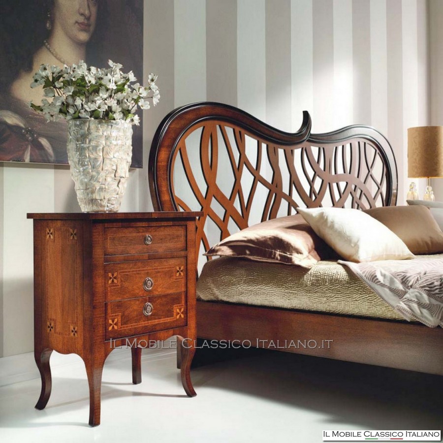 Dieser Nachttisch aus Walnussholz ist, wie alle Elemente der Dolce casa -Kollektion, eine Sammlung von Möbeln in verschiedenen Stilrichtungen , um Ihre Einrichtung harmonisch zu vervollständigen und eine warme und einladende Atmosphäre zu schaffen. Das Hauptmerkmal dieser klassischen Möbel ist die Komplexität der Konstruktion, tatsächlich sind viele dieser Möbel abgerundet, geformt oder geschnitzt. Sie haben Seiten mit Paneelen, die in eine oder zwei Richtungen gebogen sind. Auf die Oberflächen werden Intarsien aus seltenen und kostbaren Essenzen wie nationaler Nussbaum, Walnussfeder, Bois de Rose, Palisander, Ahorn, Olive, Bois de Violette, Zebrano- oder Eschenmaser, Eiche, Walnuss, Myrte, persischer Nussbaum, Olive aufgebracht Baum. Die Verarbeitung dieser klassischen Möbel erfordert viel Geschick und Erfahrung.