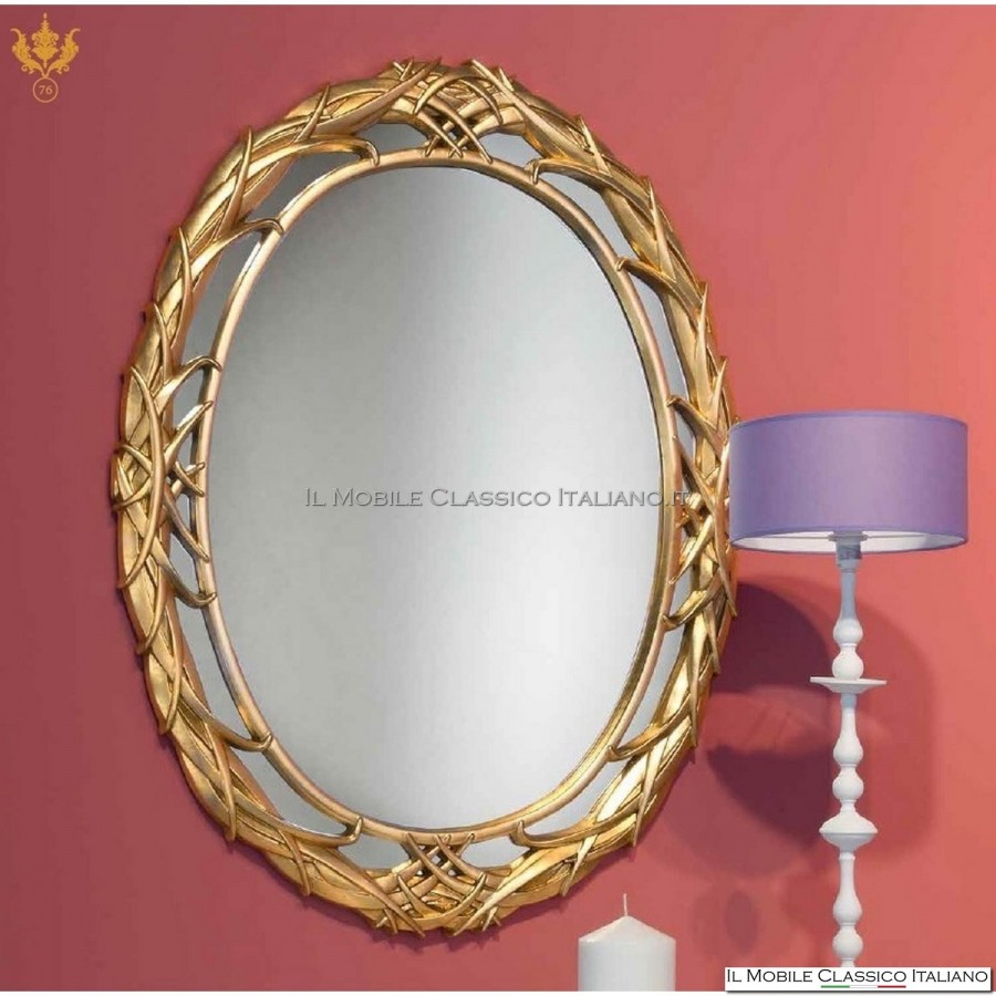 Ovaler Spiegel mit geschwungenen Linienschnitzereien am Rahmen