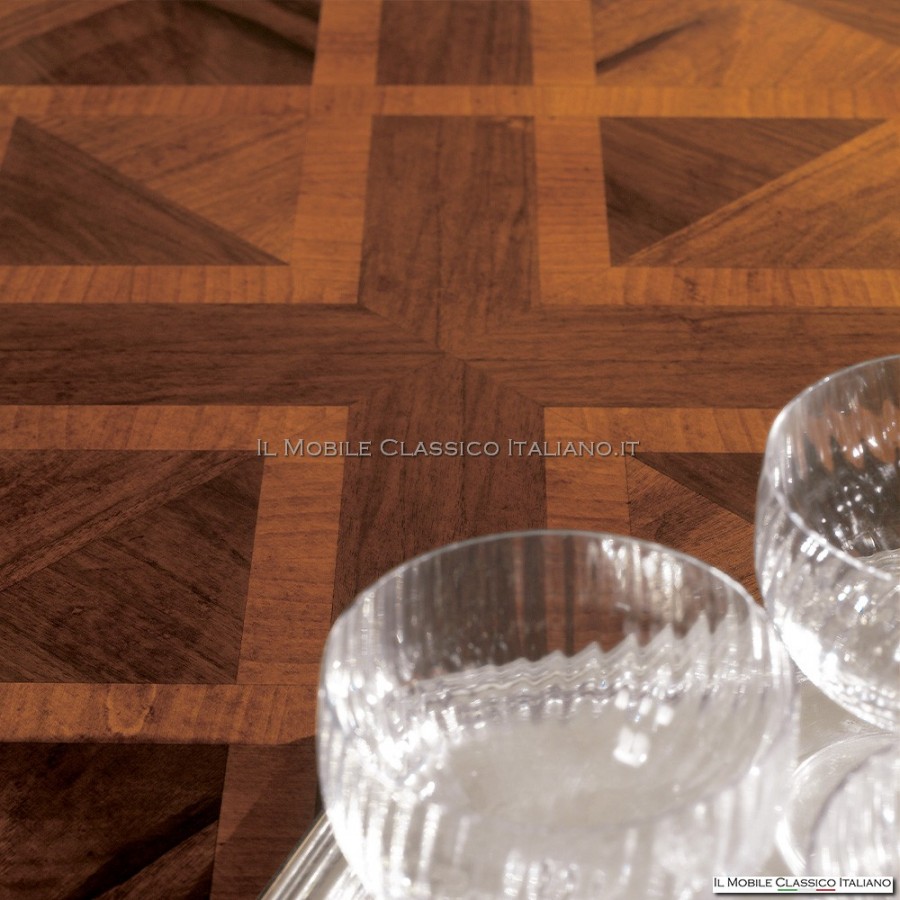 Der klassische Esstisch ist immer eine ausgezeichnete Wahl, um Ihr Zuhause mit Stil und Raffinesse einzurichten. Wenn Sie auf der Suche nach einem klassischen Esstisch sind, sind Sie bei uns genau richtig. Unser klassischer Esstisch in quadratischer Ausführung, mit der Möglichkeit, ihn dank der Verlängerungen auf bis zu 2 Meter zu verlängern, hat eine Platte mit Intarsien, die mit Sorgfalt und Liebe zum Detail von Hand gefertigt wurde. Dadurch wird jeder Esstisch einzigartig und elegant. Ein klassischer quadratischer ausziehbarer Esstisch mit Intarsienplatte ist eine elegante Ergänzung für jedes Esszimmer oder jede Küche. Diese Tische sind aus hochwertigem Massivholz gefertigt und auf Langlebigkeit ausgelegt. Das eingelegte Oberteil fügt einen Hauch von Eleganz hinzu, während die ausziehbare Funktion es perfekt für die Ausrichtung größerer Dinnerpartys macht.