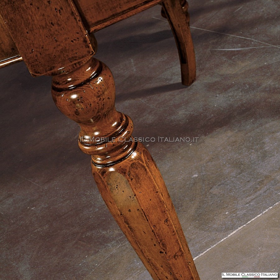 Unser runder ausziehbarer Esstisch verfügt über eine eingelegte Platte, die mit fachmännischer Handwerkskunst gefertigt wurde. Intarsien sind eine Technik, bei der verschiedene Edelholzarten so eingesetzt werden, dass ein dekoratives Muster auf der Tischplatte entsteht. Die Besonderheit dieses Tisches sind die 60 cm langen Verlängerungsplatten, die das Intarsienmuster der Hauptplatte originalgetreu nachbilden, um bei ausgezogenem Tisch eine ästhetische Kontinuität zu gewährleisten. Ihre Besonderheit, das Design der Intarsien auf der Tischplatte zu reproduzieren, garantiert eine perfekte visuelle Harmonie und erzeugt einen ästhetischen Effekt von großer Wirkung.