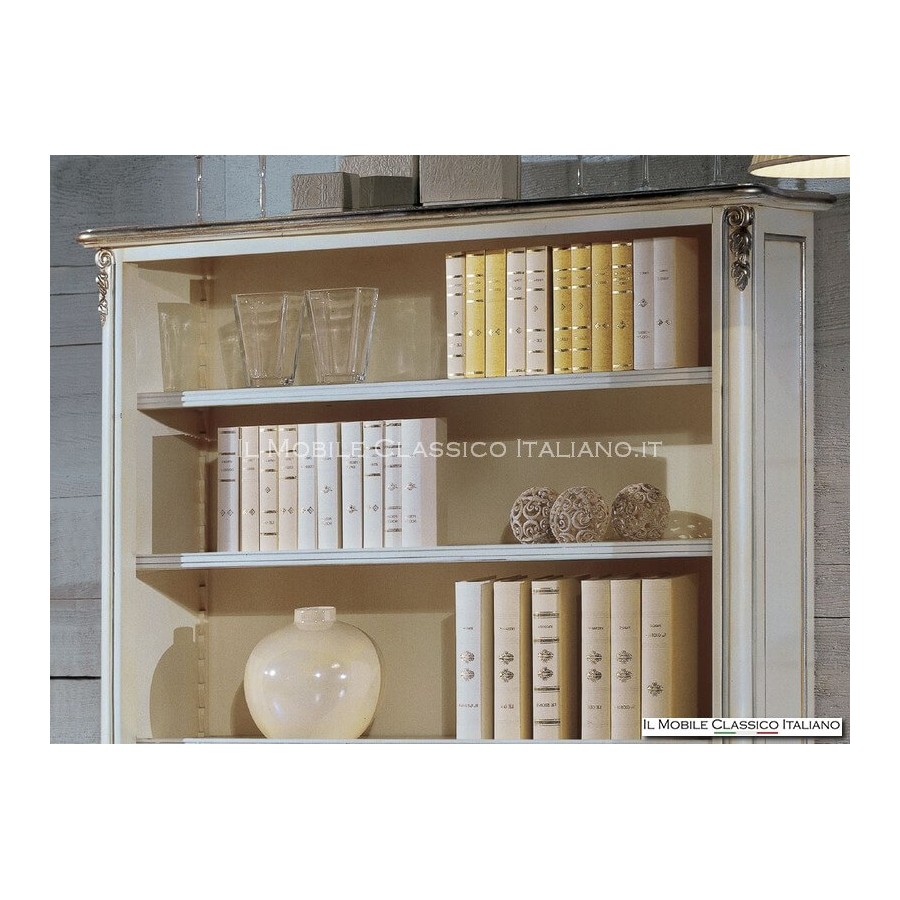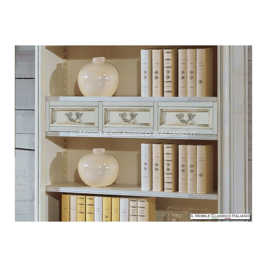 Dieses provenzalische Bücherregal besteht aus 5 offenen Fächern und 3 zentralen Schubladen. Die Hüften sind geschlossen. Die Struktur ist komplett aus Massivholz und hat Schnitzereien an den Beinen und Profilen, die in der Farbe wie auf dem Foto durch das Blattsilber aufgewertet wurden. Die Bücherregalmöbel im Stil 700 sind in der Lage, Eleganz und Funktionalität in einer einzigen Lösung perfekt zu kombinieren, die richtige Ergänzung, um Ihrem Zuhause ein luxuriöses Aussehen zu verleihen.