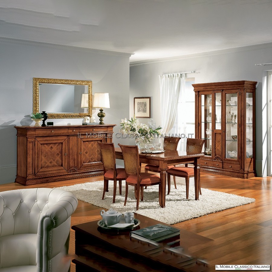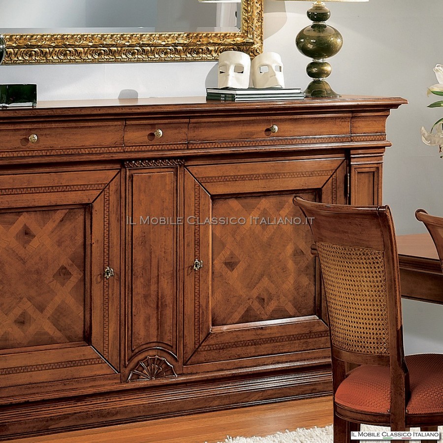 Das Sideboard aus Holz mit 2 Türen und 3 Schubladen, mit dem charakteristischen geschnitzten Rahmen unter den Schubladen und an den Türen, ist ein vielseitiges Möbelstück, das dank der Kapazität seines Innenraums auch als Barschrank verwendet werden kann Flaschen und Zubehör aufbewahren.