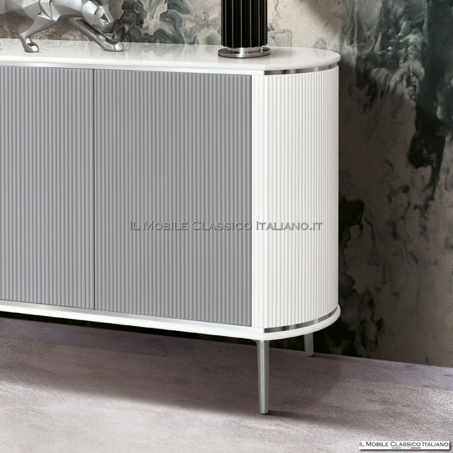 Moderne Anrichte mit 157 cm, gerillten Türen, anpassbaren Oberflächen, wählbaren Füßen und handgefertigten Details Made in Italy. Maßgeschneiderte Eleganz und Funktionalität.