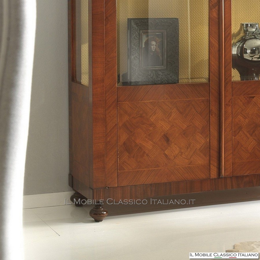 Diese klassische Vitrine mit Intarsien ist , wie alle Elemente der Dolce casa -Kollektion, eine Sammlung von Möbeln in verschiedenen Stilen, um Ihre Einrichtung harmonisch zu vervollständigen und eine warme und einladende Atmosphäre zu schaffen. Das Hauptmerkmal dieser klassischen Möbel ist die Komplexität der Konstruktion, tatsächlich sind viele dieser Möbel abgerundet, geformt oder geschnitzt. Sie haben Seiten mit Paneelen, die in eine oder zwei Richtungen gebogen sind. Auf die Oberflächen werden Intarsien aus seltenen und kostbaren Essenzen wie nationaler Nussbaum, Walnussfeder, Bois de Rose, Palisander, Ahorn, Olive, Bois de Violette, Zebrano- oder Eschenmaser, Eiche, Walnuss, Myrte, persischer Nussbaum, Olive aufgebracht Baum. Die Verarbeitung dieser klassischen Möbel erfordert viel Geschick und Erfahrung.