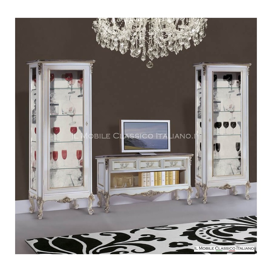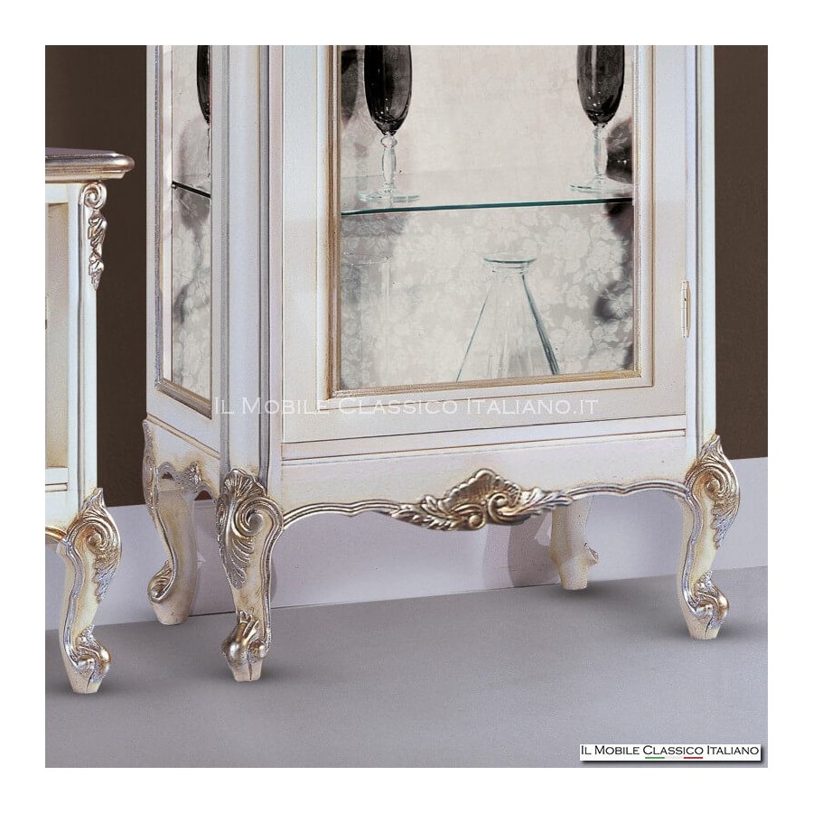 Diese Vitrine im provenzalischen Stil besteht aus 1 Tür und 4 Regalen. Die Seiten haben Glas wie die Front. Die Struktur ist komplett aus Massivholz und hat Schnitzereien an den Beinen und Profilen, die in der Farbe wie auf dem Foto durch das Blattsilber aufgewertet wurden. Die Vitrine im Stil 700 ist in der Lage, Eleganz und Funktionalität in einer einzigen Lösung perfekt zu kombinieren, die richtige Ergänzung, um Ihrem Zuhause einen luxuriösen Look zu verleihen.
