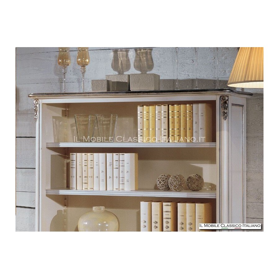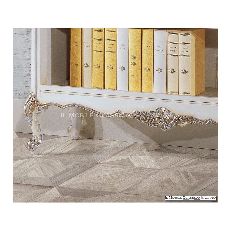 This Provencal bookcase consists of 4 open compartments. The hips are closed. The structure is entirely in solid wood and has carvings on the legs and profiles, which in the color as in the photo have been enhanced by the silver leaf. The 700 style bookcase furniture is able to perfectly combine elegance and functionality in a single solution, the right complement to give a luxurious look to your home.