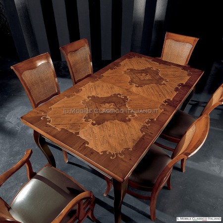 Price €1,517.25The rectangular dining table with inlaid top is a great choice for those who want to add a touch of elegance to their dining room. Inlay is a decorative art which consists in inserting different pieces of wood in various essences into the table top. In this case, the table is equipped with a wooden top with inlay, which gives the table a high-quality and exclusive look.