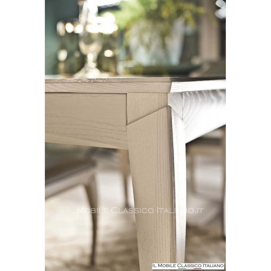 Ash, the wood used for the construction of this table, is worked with the brushing technique: it is an excellent choice for the creation of high quality furniture. This fine wood is known for its strength and durability, as well as its distinctive grain that gives it a natural and sophisticated look. The brushing process further enhances the beauty of the wood, creating a texture that is pleasant to the touch and visually appealing. A modern square extendable table in brushed ash adds a touch of elegance and sophistication to any room, making it a central piece of furniture.