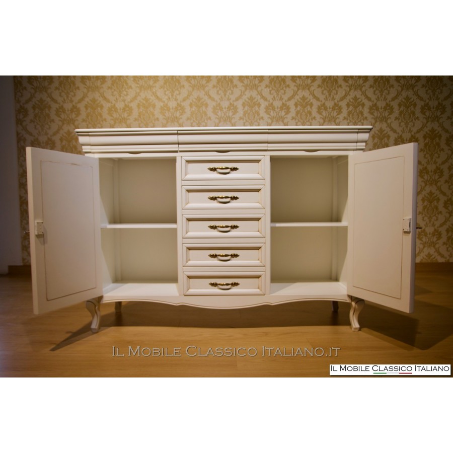 The contemporary sideboard , has a very particular design of the legs, made of solid wood thanks to cnc machines that allow the creation of very complex shapes and curves. The cabinet consists of 2 very capacious side doors with a fixed shelf, a series of central drawers where you can arrange objects with a smaller footprint (for example cutlery if it is placed in the dining room) and a trio of drawers hidden on the cornice of the furniture.