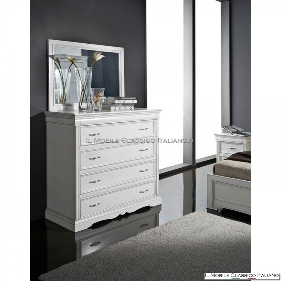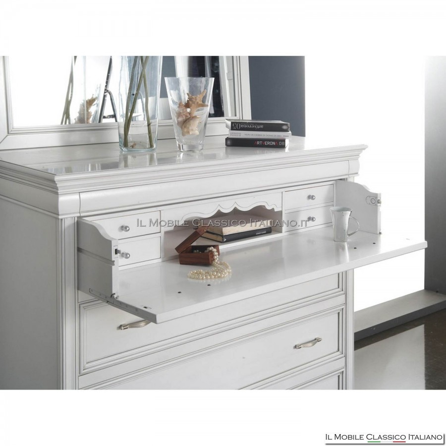 Chest of drawers with 5 drawers with flap, inside which there are 4 drawers, and with shaped plinth. The chest of drawers has a secret drawer placed on the crosspiece under the top. The Harmony style proposed in this collection combines the modern style with the classic one, making it one.