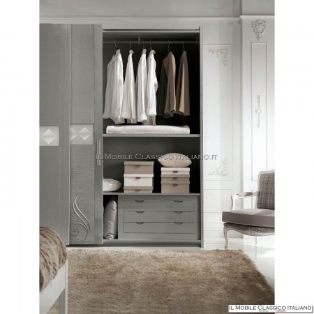 The wardrobes of the Gisellè collection are all composed of sliding doors , and have an internal chest of drawers , shelves and clothes rails. The various wardrobes of the Gisellè collection differ in the sliding mirrored doors or with inserts in satin glass rather than in wood or for the presence of the decoration. The size and shape of these wardrobes adapt to current furnishing needs and therefore make it a typical example of contemporary classic furniture .