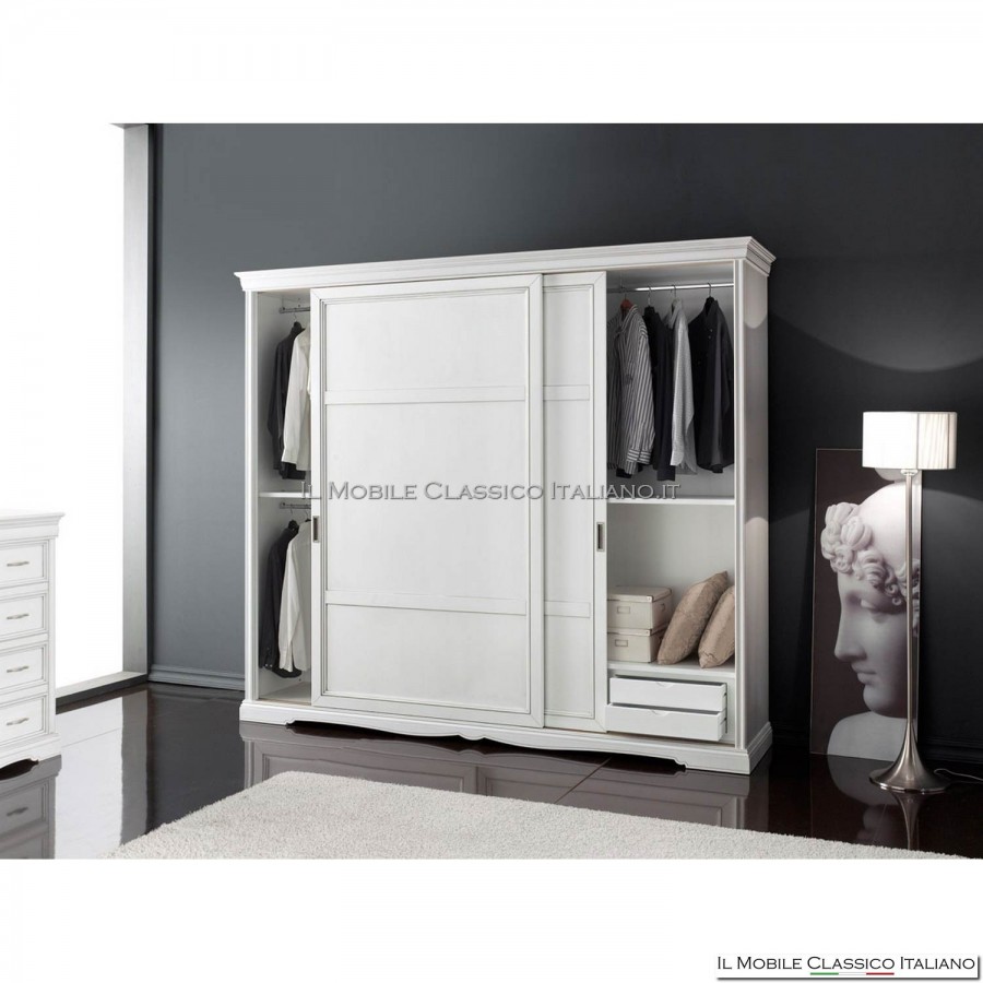 Armario con 2 puertas correderas de madera, en el interior hay una cómoda con estantes y postes, con zócalo perfilado. El estilo Harmony propuesto en esta colección combina el estilo moderno con el clásico, convirtiéndolo en uno.