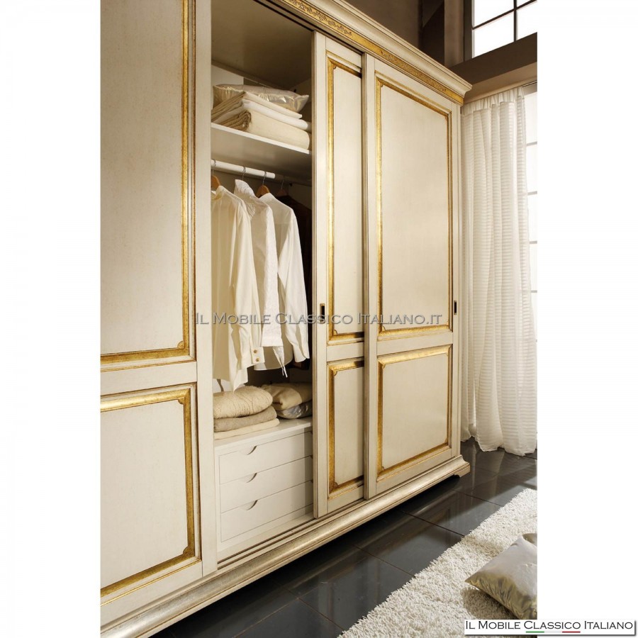 En el interior del clásico armario tallado con 3 puertas correderas hay estantes y postes , y un accesorio a pedido es la inserción de una cómoda con 3 cajones.