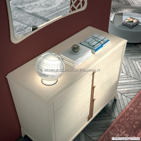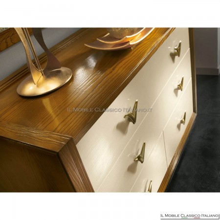 Esta cómoda de fresno es un mueble moderno, de líneas simples y lineales , perfecto para quien busca soluciones de decoración modernas y refinadas. En el frente del mueble hay una agradable decoración en relieve, que puede ser del mismo color que el mueble o en pan de oro o plata.