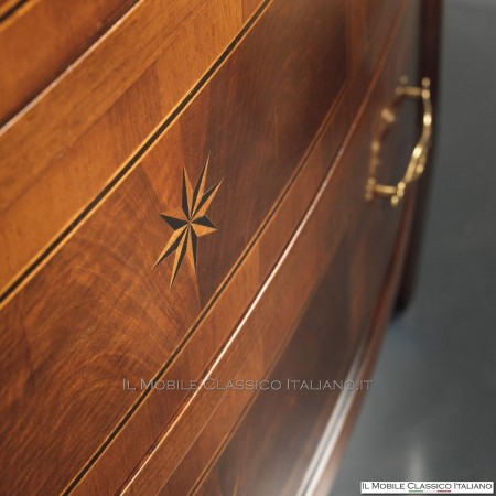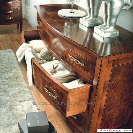 Esta cómoda taraceada , como todos los elementos de la colección Dolce casa , es una colección de muebles de varios estilos para completar armónicamente tu decoración y crear un ambiente cálido y acogedor. La característica principal de estos muebles clásicos es la complejidad de la construcción, de hecho muchos de estos muebles son redondeados, moldeados o tallados. Tienen laterales realizados con paneles curvos en una o dos direcciones. Las incrustaciones se aplican en las superficies, hechas de esencias raras y preciosas como nuez nacional, pluma de nuez, bois de rose, palisandro, arce, olivo, bois de violette, zebrano o fresno, roble, nuez, mirto, nuez persa, olivo árbol. El procesamiento de estos muebles clásicos requiere una gran habilidad y experiencia.