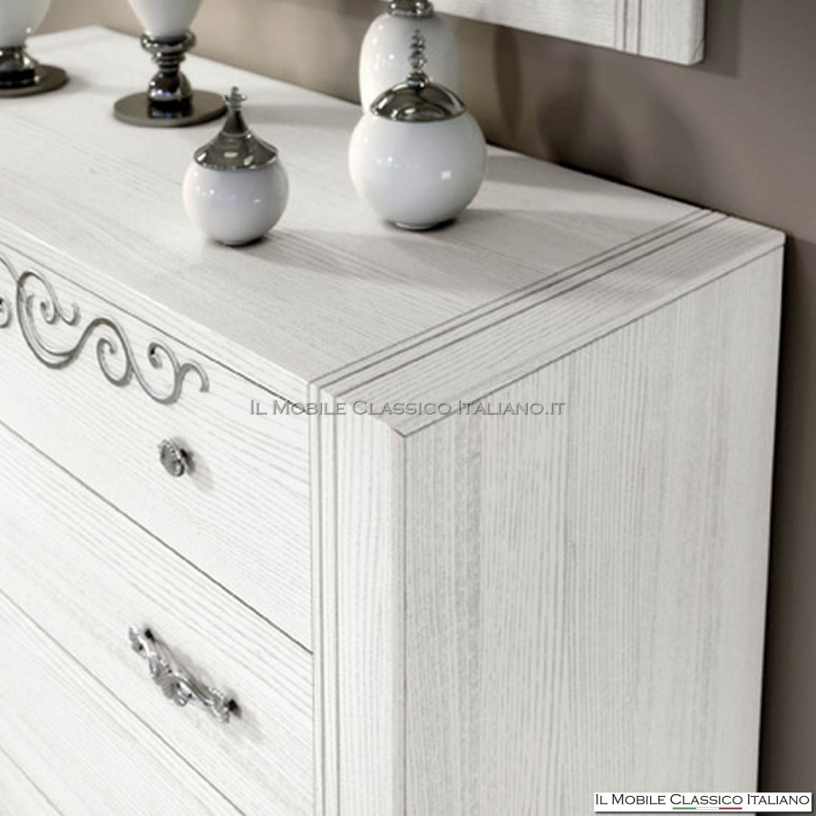 Esta cómoda de fresno es un mueble moderno, con las líneas redondeadas de los lados y las tallas de las patas , perfecta para quien busca soluciones de decoración modernas y refinadas. En el frente del mueble hay una agradable decoración floral en relieve, que puede ser del mismo color que el mueble o en pan de oro o plata.
