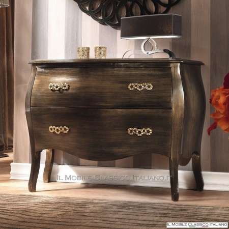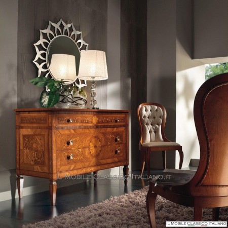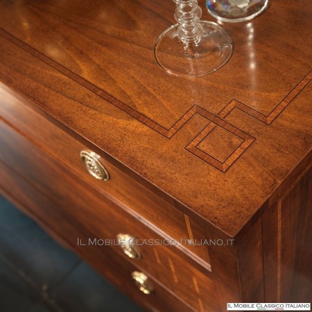 Esta cómoda redondeada , como todos los elementos de la colección Dolce casa , es una colección de muebles de varios estilos para completar con armonía tu decoración y crear un ambiente cálido y acogedor. La característica principal de estos muebles clásicos es la complejidad de la construcción, de hecho muchos de estos muebles son redondeados, moldeados o tallados. Tienen laterales realizados con paneles curvos en una o dos direcciones. Las incrustaciones se aplican en las superficies, hechas de esencias raras y preciosas como nuez nacional, pluma de nuez, bois de rose, palisandro, arce, olivo, bois de violette, zebrano o fresno, roble, nuez, mirto, nuez persa, olivo árbol. El procesamiento de estos muebles clásicos requiere una gran habilidad y experiencia.