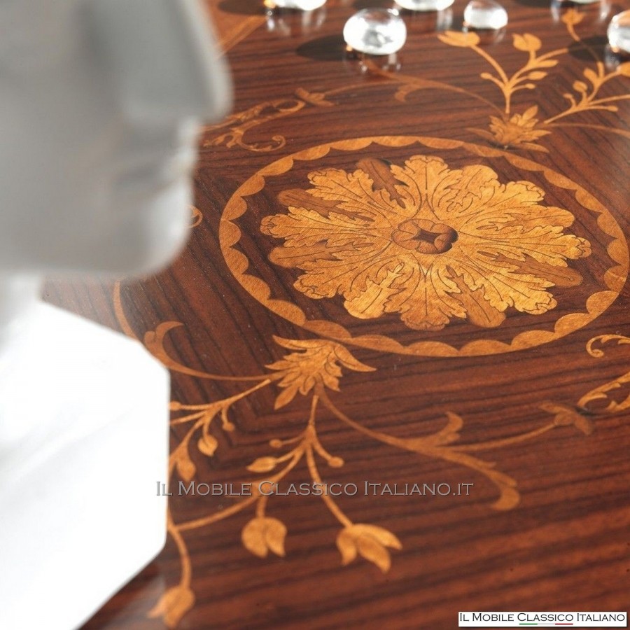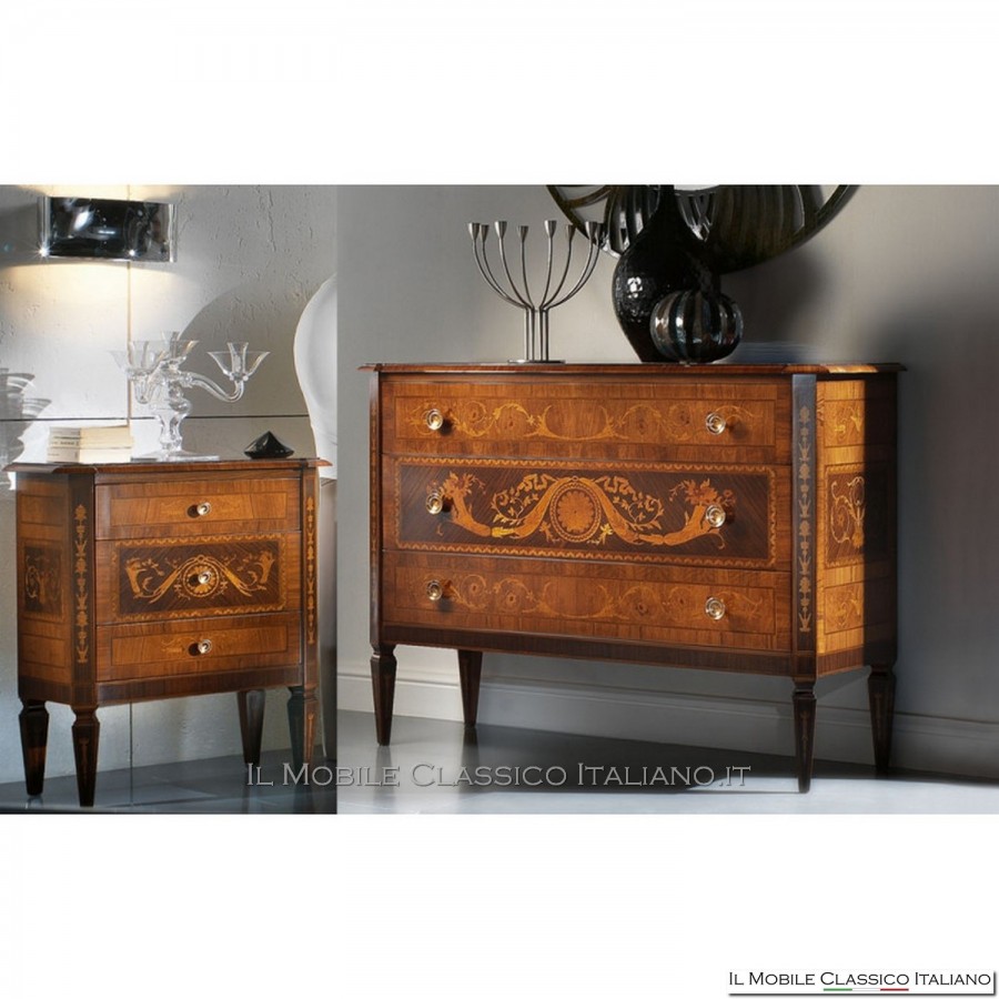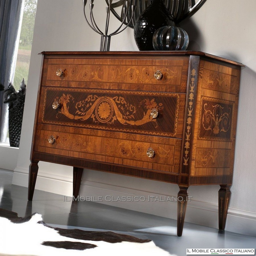 Esta cómoda de estilo clásico con incrustaciones que permite amueblar con gusto y elegancia las estancias de cualquier hogar está inspirada en el maestro ebanista Maggiolini, son obras únicas realizadas con técnicas ancestrales que transmiten la maestría del pasado a nuestros días.