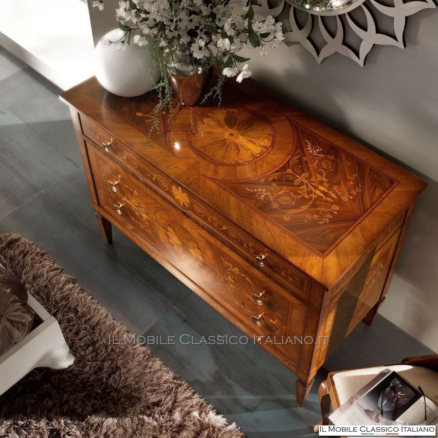 Esta cómoda Maggiolini , como todos los elementos de la colección Dolce casa , es una colección de muebles de varios estilos caracterizada por el uso de incrustaciones y nudos de madera preciosa para completar armoniosamente sus muebles y crear un ambiente cálido y acogedor.