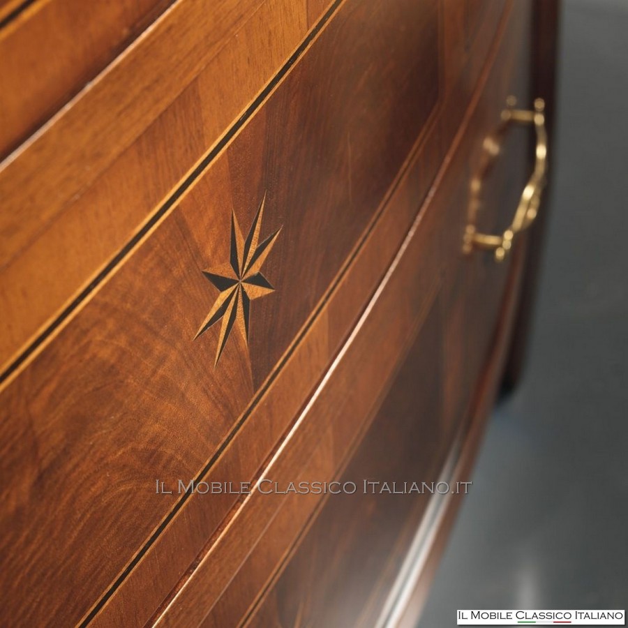 La cómoda con forma , con 3 cajones y estrella incrustada en la parte superior. Está enteramente construido con maderas preciosas de diferentes orígenes, y decorado en varios lados con incrustaciones .
