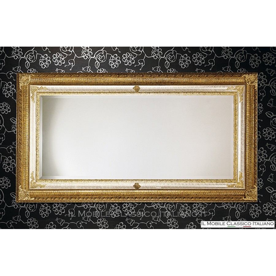 Este gran espejo barroco rectangular está fabricado en madera y pulpa de madera, el marco tiene un núcleo interno en madera maciza, para garantizar resistencia y solidez al producto y la parte superficial en pulpa de madera.