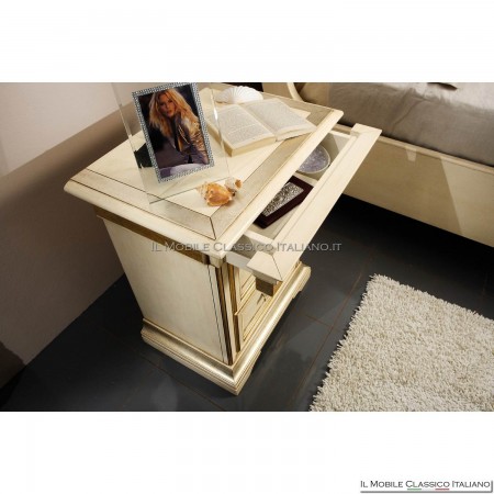 Precio 582,31 €Mesita de noche clásica lisa con decoración y 3 cajones, en madera maciza hecha en Italia