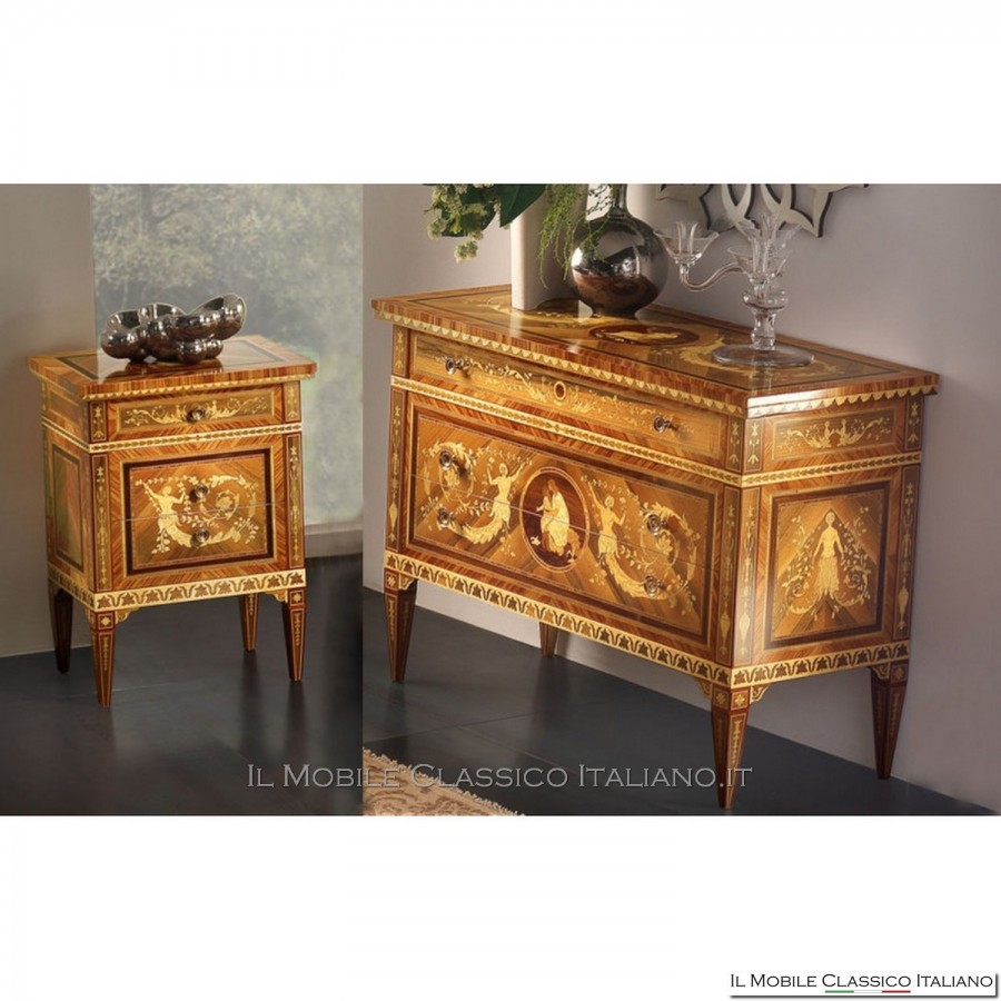 Este par de mesitas de noche con incrustaciones de estilo clásico le permite amueblar el área de descanso de su hogar con gusto y elegancia. Los ambientes, aunque sean de estilo contemporáneo/moderno, pueden integrar objetos de nuestra tradición italiana de ebanistas, creando un ambiente cálido y acogedor.