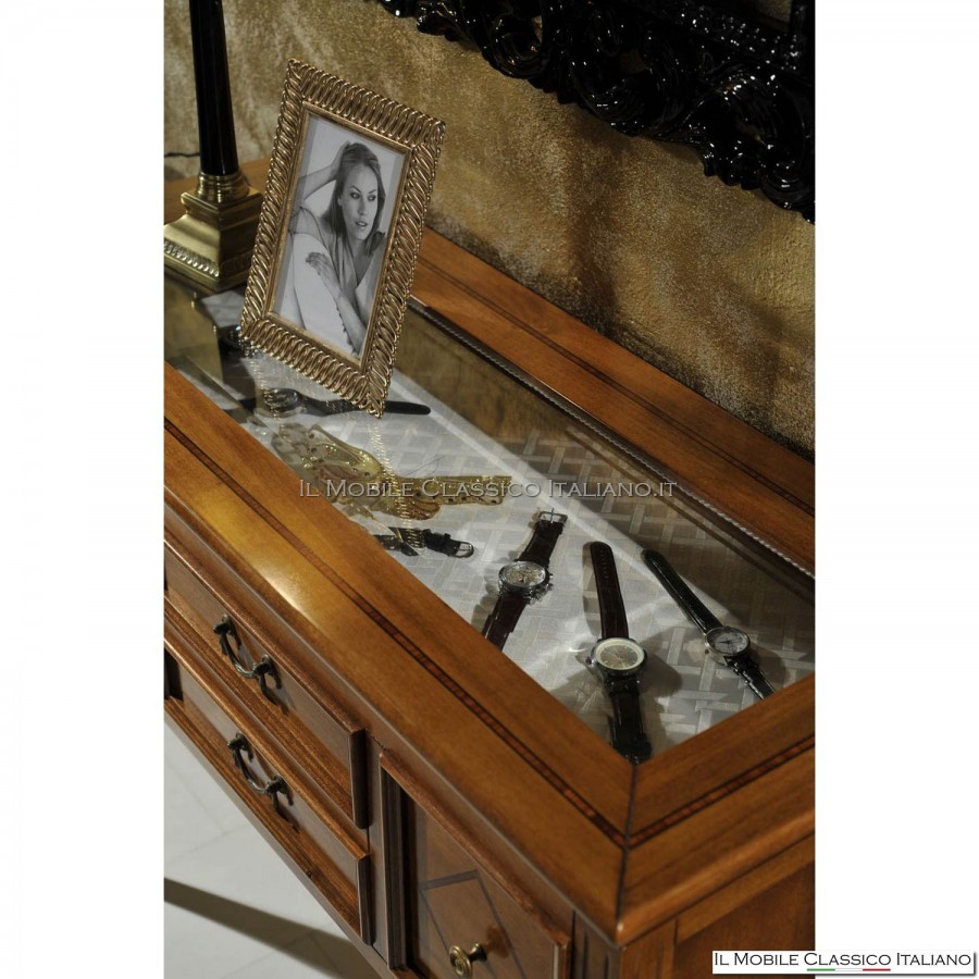 Consola compuesta por 4 cajones y tapa abatible. Los cajones, equipados con tiradores y pomos, están fabricados según un método antiguo y artesanal llamado ensamble en "cola de milano", tienen los fondos y los costados de madera maciza de abeto. Las paredes laterales, en los costados, están talladas con surcos que corren a lo largo de la altura. La parte superior, que se abre a la solapa, tiene un cristal para que puedas apreciar mejor los objetos del interior; En la parte de madera se engasta un filete de Bois de Rose, cuya aplicación es el resultado de un trabajo manual, lo que hace que cada pieza sea única. Como todos los accesorios de la colección Modigliani , la consola se caracteriza por un tallado champlevé debajo del marco y por las típicas patas en forma de sable, que la convierten en un elemento único en su género para amueblar su hogar con un estilo refinado y buscado. después.
