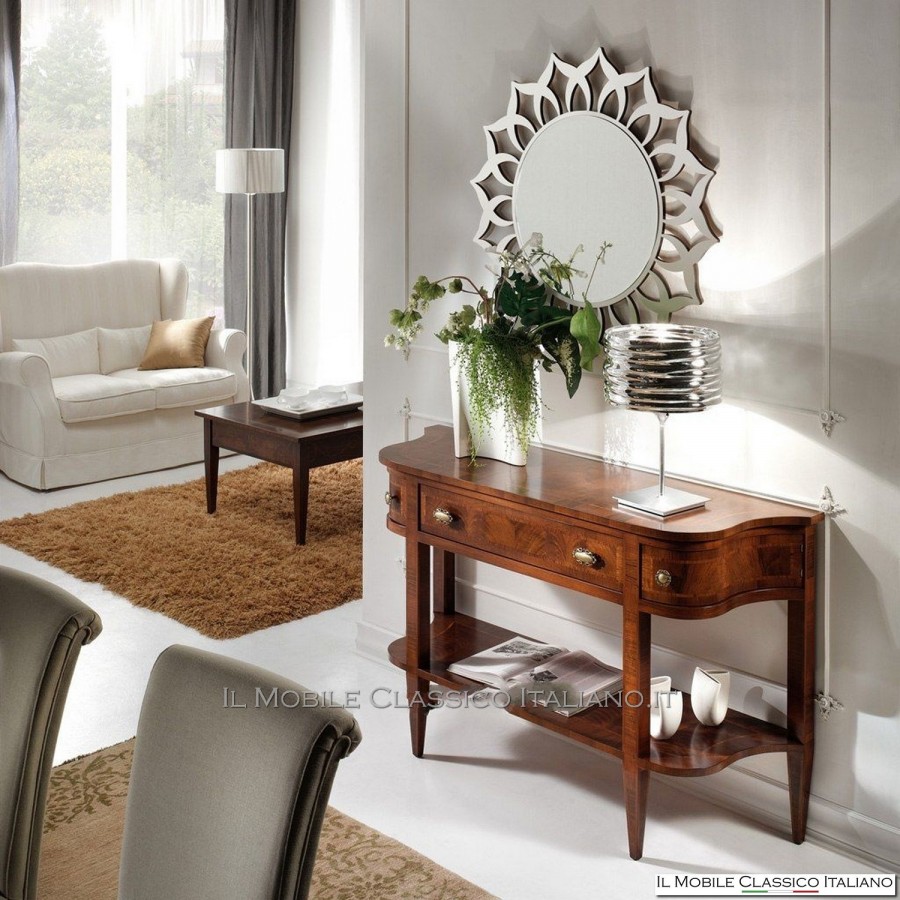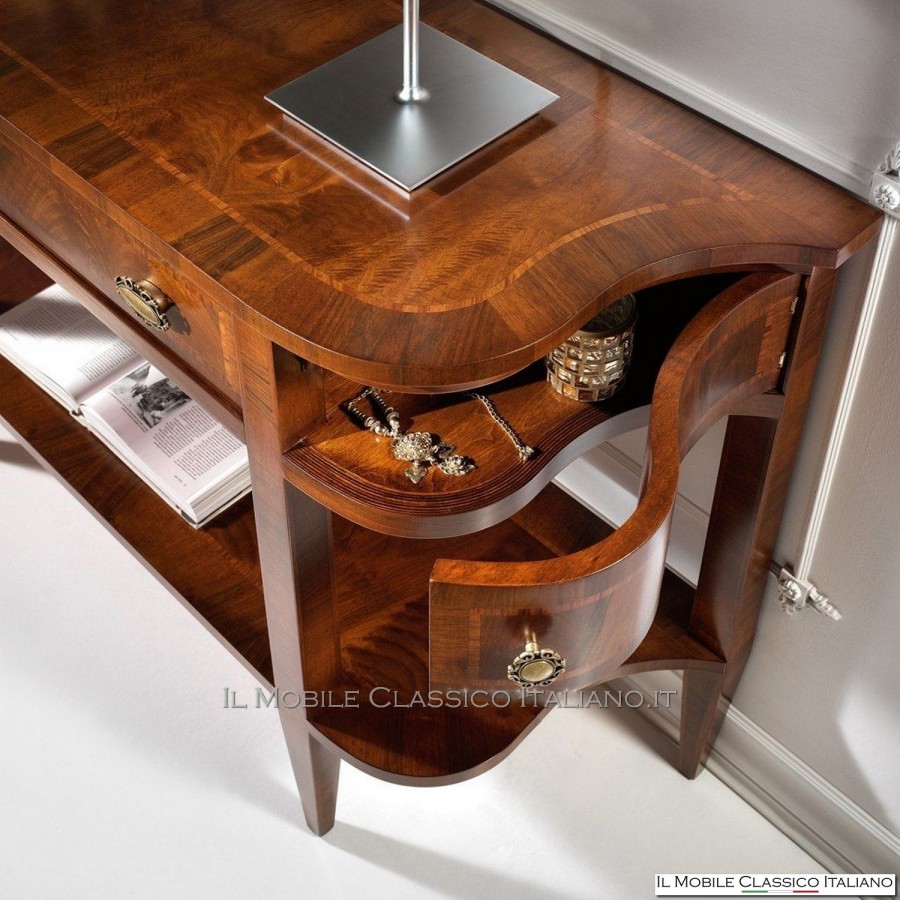 Esta consola de recibidor , como todos los elementos de la colección Dolce casa , es una colección de muebles clásicos para completar con armonía tus muebles y crear un ambiente cálido y acogedor. La característica principal de estos muebles clásicos es la complejidad de la construcción, de hecho muchos de estos muebles son redondeados, moldeados o tallados. Tienen laterales realizados con paneles curvos en una o dos direcciones. Las incrustaciones se aplican en las superficies, hechas de esencias raras y preciosas como nuez nacional, pluma de nuez, bois de rose, palisandro, arce, olivo, bois de violette, zebrano o fresno, roble, nuez, mirto, nuez persa, olivo árbol. El procesamiento de estos muebles clásicos requiere una gran habilidad y experiencia.