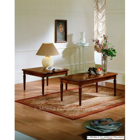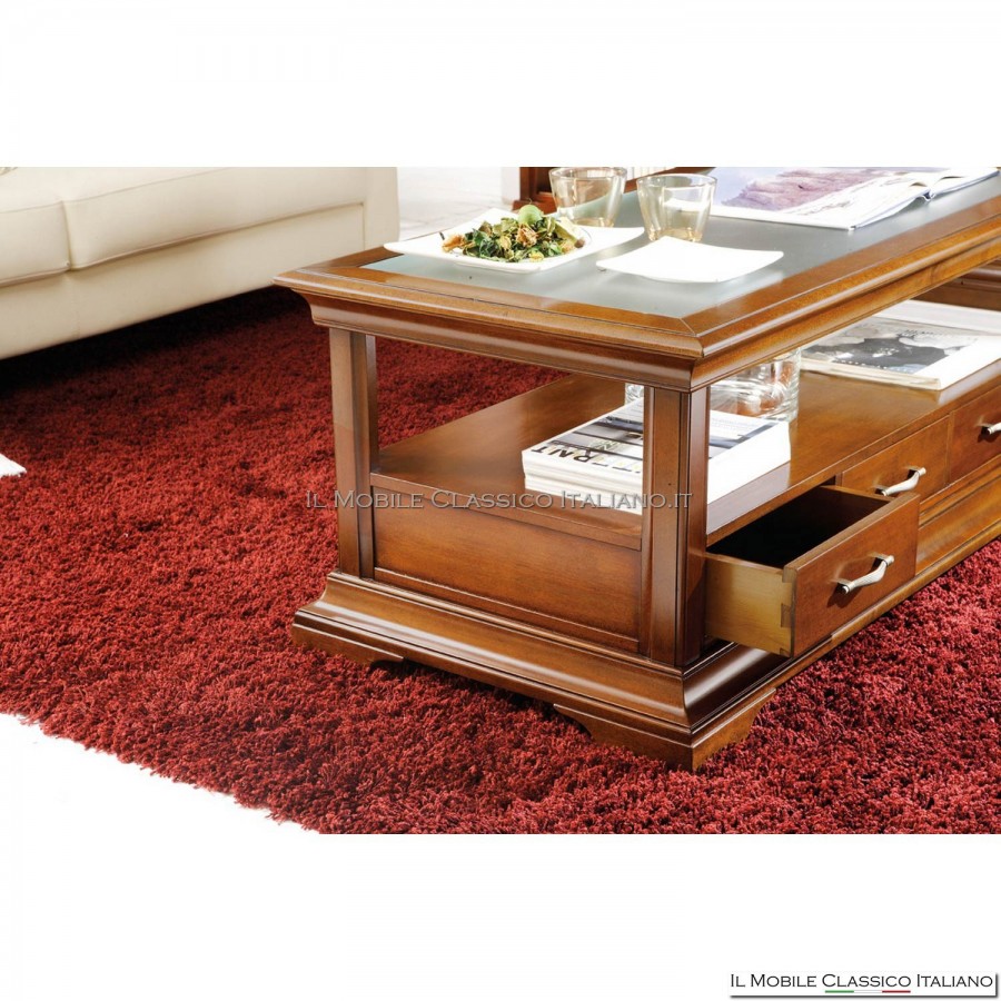Mesa de centro rectangular clásica compuesta por 3 cajones y un compartimento de almacenamiento debajo de la tapa que es de cristal blanco satinado. Los cajones, colocados en la parte inferior, están fabricados según un método antiguo y artesanal llamado "cola de milano", tienen los fondos y los costados de madera maciza de abeto.