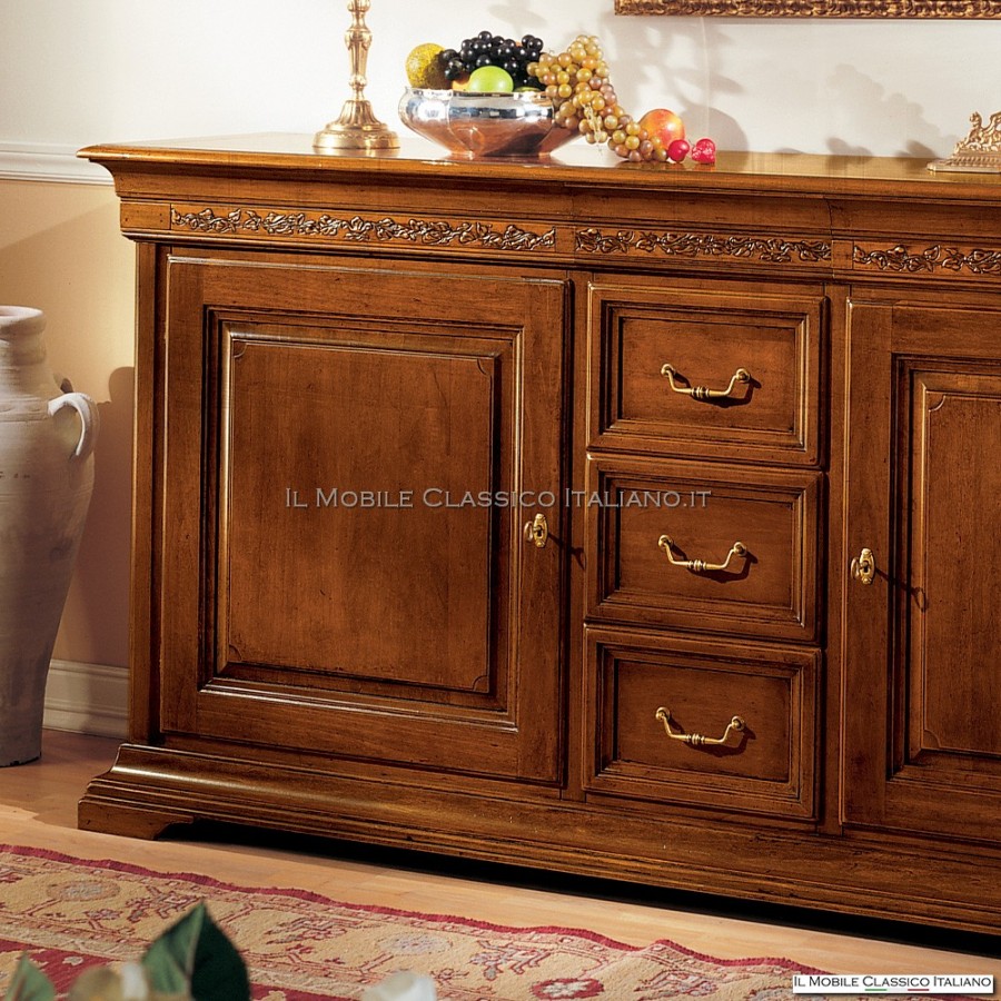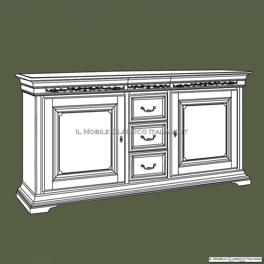 El aparador Arte Povera , en la versión con tallado en el marco, tiene 2 puertas y 3 cajones centrales , además de los 3 cajones secretos ocultos en la repisa de la parte superior del mueble aparador.