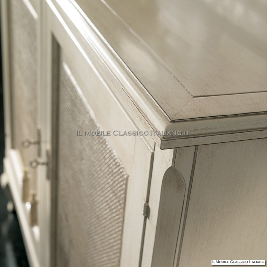 El aparador de madera blanca está acabado hasta el más mínimo detalle , con una artesanía de alta calidad que le da al mueble un aspecto único y precioso. Los tiradores metálicos, perfectamente integrados con el estilo del mueble, crean un bonito contraste que aporta elegancia al mueble.