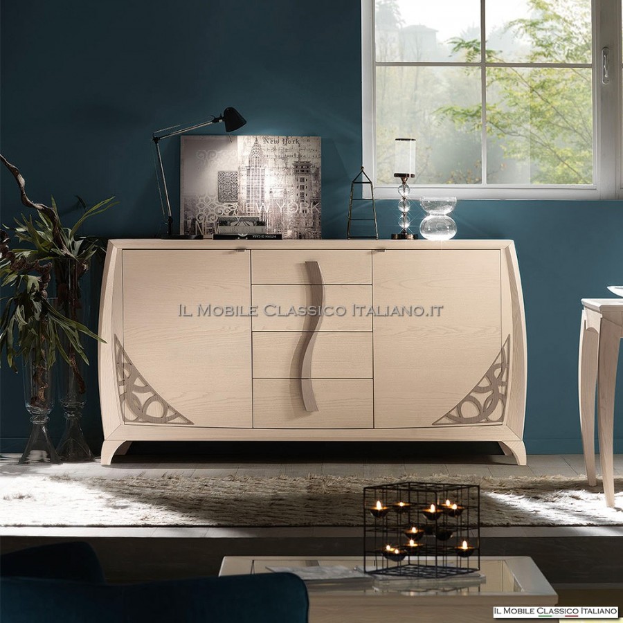 El moderno aparador de fresno con grecas es extremadamente versátil y se adapta fácilmente a diferentes estancias de la casa. Se puede utilizar en el salón como mueble de televisión, en el comedor para guardar vajilla y cubertería, o en la entrada para organizar objetos cotidianos. La combinación de 2 puertas y 4 cajones ofrece soluciones de almacenamiento diversificadas, ideales para mantener el orden y optimizar el espacio. Una característica particular de este aparador moderno de fresno con grecas es la posibilidad de personalizar la greca en el mismo color que el aparador o en un color diferente a nuestra propuesta. Explore las fotos para admirar las distintas combinaciones de acabados posibles.