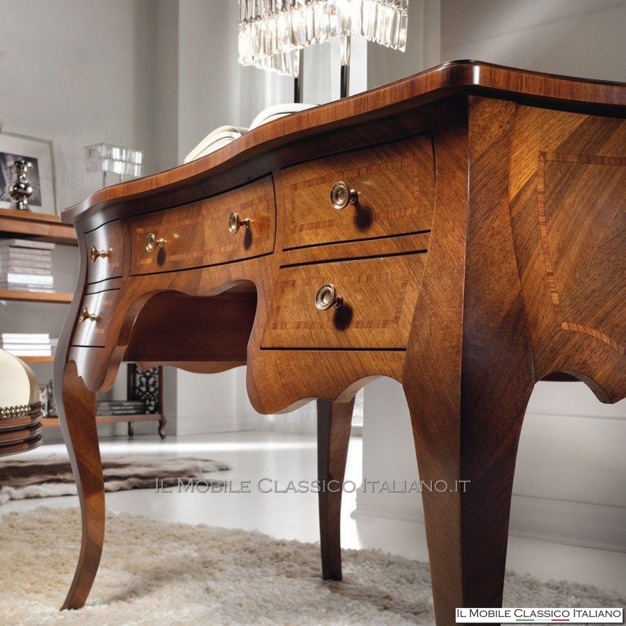 Este clásico escritorio de nogal , como todos los elementos de la colección Dolce casa , es una colección de muebles de varios estilos para completar armónicamente tu decoración y crear un ambiente cálido y acogedor. La característica principal de estos muebles clásicos es la complejidad de la construcción, de hecho muchos de estos muebles son redondeados, moldeados o tallados. Tienen laterales realizados con paneles curvos en una o dos direcciones. Las incrustaciones se aplican en las superficies, hechas de esencias raras y preciosas como nuez nacional, pluma de nuez, bois de rose, palisandro, arce, olivo, bois de violette, zebrano o fresno, roble, nuez, mirto, nuez persa, olivo árbol.