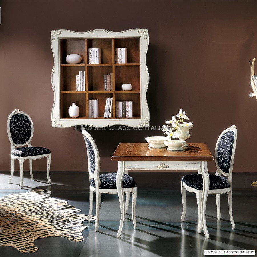 Si buscas una mesa de salón extensible cuadrada con un diseño único y elegante, la mesa con la característica apertura de libro con estilizada taracea en forma de estrella y cenefa en el lateral es la solución perfecta. Esta mesa tiene una incrustación en forma de estrella en la parte superior y un friso tallado en los bordes, que le dan un toque de elegancia a tu salón. Además, las patas de sable construidas en madera maciza aseguran estabilidad y robustez, asegurando solidez. La mesa es uno de los elementos esenciales en la sala de estar, ya que representa el punto de encuentro de la casa, donde se comparten los momentos de convivencia y la vida cotidiana. La mesa ideal para el ambiente de la sala de estar debe ser funcional y al mismo tiempo estéticamente atractiva.