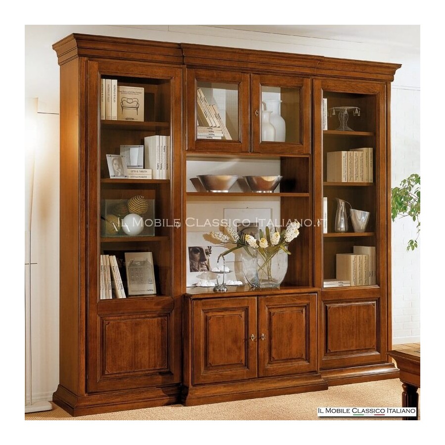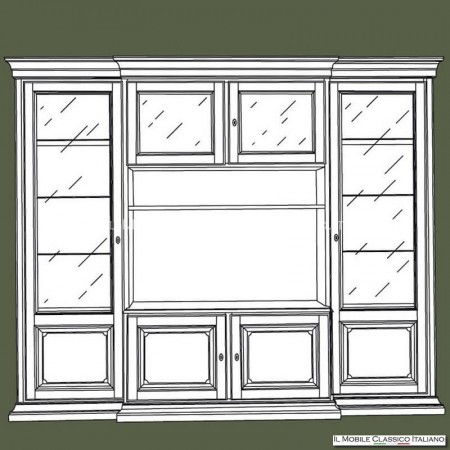 Pared equipada con vitrina clásica en composición, en la versión lisa, compuesta por 2 vitrinas altas semicerradas, y en la banda central dispone de 2 compartimentos dobles y una balda.