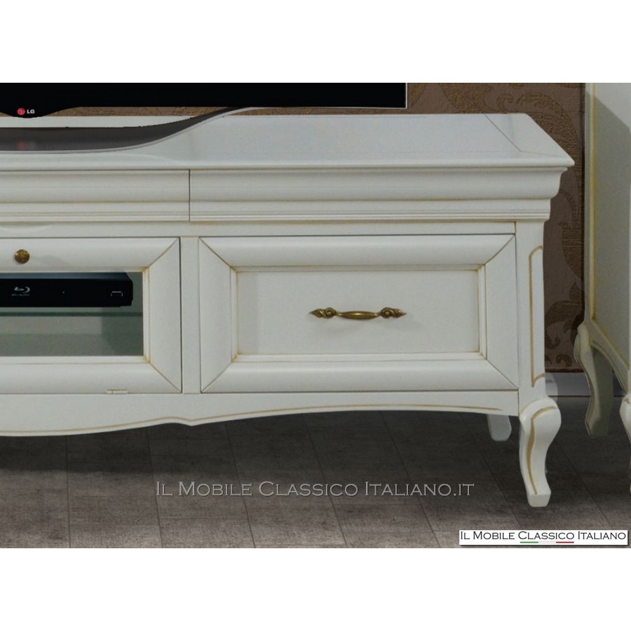 El soporte de la televisión , tiene un diseño muy particular de las patas, realizadas en madera maciza gracias a máquinas cnc que permiten la creación de formas y curvas muy complejas. El mueble consta de 2 grandes cajones en los laterales, una solapa central con balda regulable en altura ideal para contener varios televisores como descodificadores o videoconsolas y un cajón oculto en el centro en el borde del mueble.