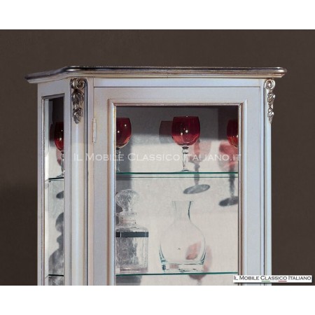 La clásica vitrina de salón se compone de 2 puertas con cerradura con llave, adornadas con vidrio esmerilado en 3 lados del mueble. Esta clásica vitrina de salón tiene la característica de tener la parte superior que se abre como un tablón de anuncios, mientras que el travesaño colocado debajo recoge la talla. En el interior, la clásica vitrina de salón cuenta con 2 baldas de cristal regulables en altura, y el respaldo está disponible tapizado, con espejo o pintado del mismo color que el mueble.