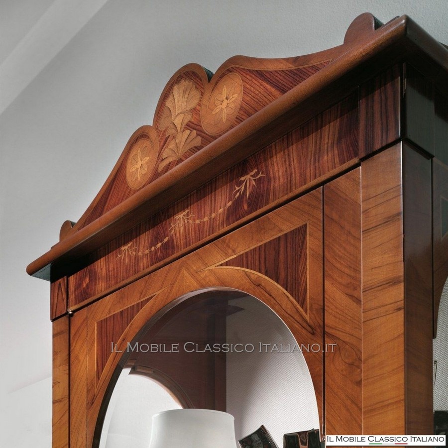 El clásico escaparate con incrustaciones de madera de olivo : muebles de estilo clásico que le permiten amueblar con gusto. La vitrina taracea , con patas torneadas, se compone de 1 puerta con cerradura con llave, y 2 baldas interiores de cristal. La parte superior tiene 3 lados en vidrio, y la parte posterior está tapizada, mientras que la estructura está completamente incrustada con esencias de Olive y Bois de Violette, y decorada con incrustaciones con un escudo en el marco. La vitrina clásica con incrustaciones de madera de olivo es capaz de combinar a la perfección elegancia y funcionalidad en una única solución, ya que puede utilizarse como vitrina clásica o como expositor .