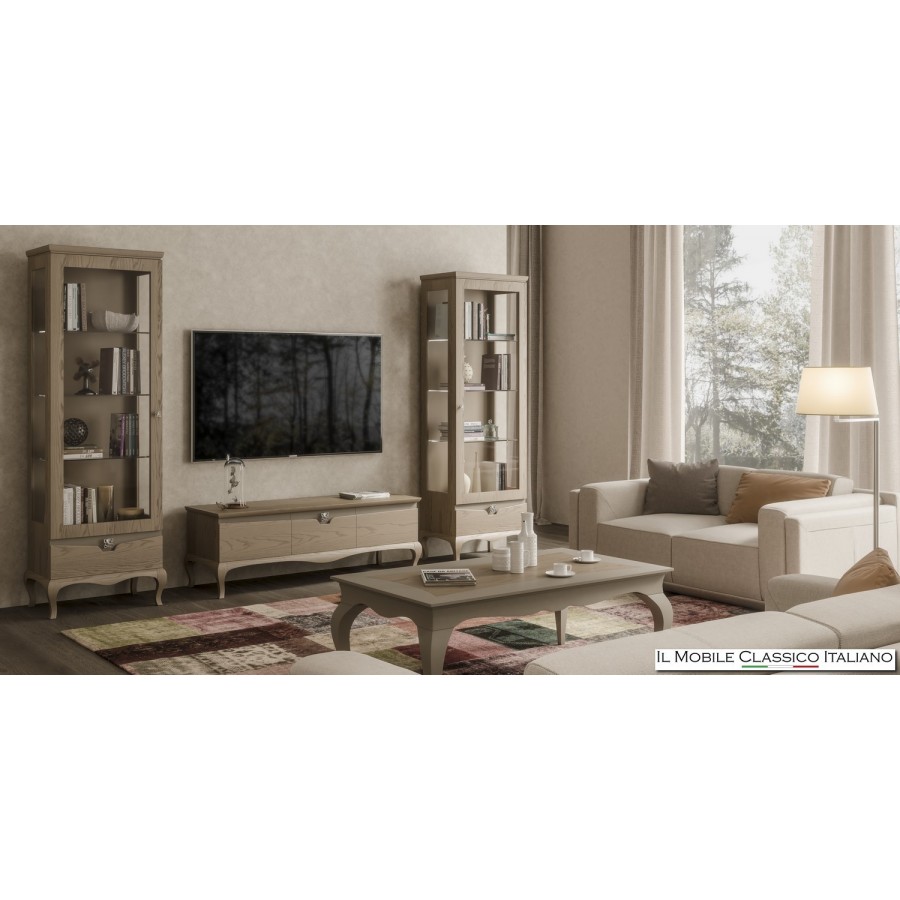 Una selección de muebles de TV forman parte de esta colección, que se suministran en combinación con varios modelos de muebles altos, vitrinas y vitrinas, mesas, mesas de centro, sillas tapizadas y todos los complementos para el dormitorio como cómodas, mesitas de noche, armarios de puertas correderas y camas de madera y camas tapizadas.