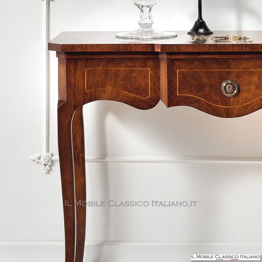 Cette console en noyer , comme tous les éléments de la collection Dolce casa , est une collection de mobilier classique pour compléter harmonieusement votre mobilier et créer une ambiance chaleureuse et accueillante. La principale caractéristique de ces meubles classiques est la complexité de la construction, en effet beaucoup de ces meubles sont arrondis, façonnés ou sculptés. Ils ont des côtés faits de panneaux incurvés dans une ou deux directions. Des incrustations sont appliquées sur les surfaces, faites d'essences rares et précieuses telles que noyer national, plume de noyer, bois de rose, palissandre, érable, olivier, bois de violette, loupe de zebrano ou de frêne, chêne, noyer, myrte, noyer persan, olivier arbre. Le traitement de ces meubles classiques nécessite une grande compétence et expérience.