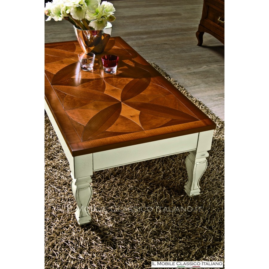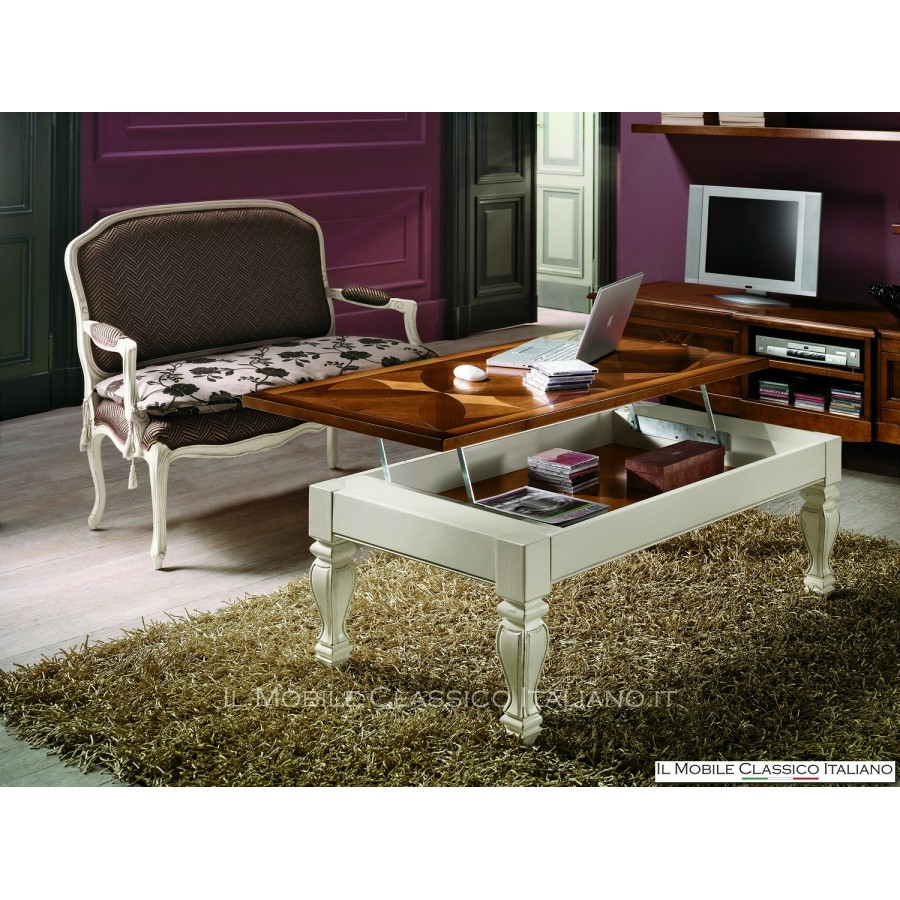 Il a une forme classique, mais avec les bonnes couleurs, nous pouvons également l'adapter à des contextes plus contemporains. La grande particularité de cette table basse est la possibilité, grâce à un mécanisme particulier, de soulever le plateau et de le déplacer vers le canapé, afin d'atteindre une hauteur plus appropriée pour les repas assis sur le canapé.