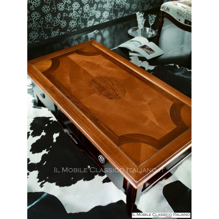 Le plateau rectangulaire est en bois de cerisier et a un design de style parquet, le corps de la table basse est à double face, et dispose de 2 tiroirs, avec joint en queue d'aronde, comme vous pouvez le voir sur la photo. Pour le reste il a une fabrication qui le compose de divers panneaux.