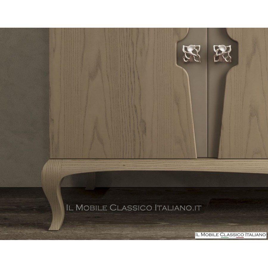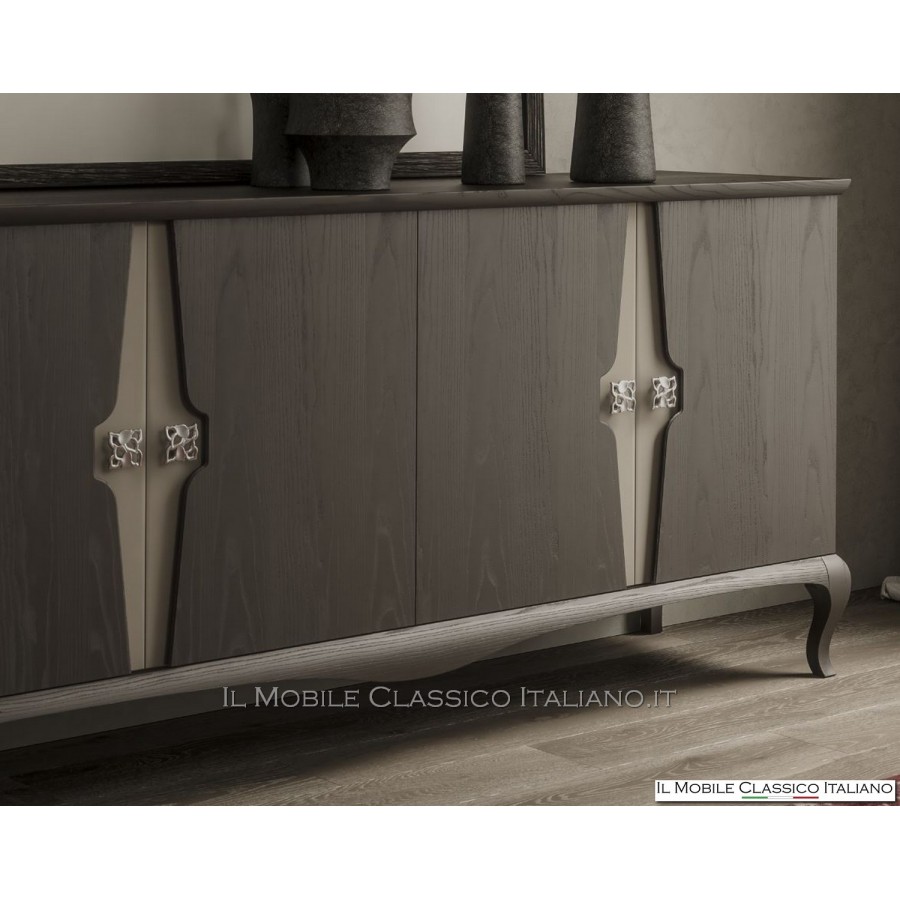 Ce buffet, de la collection de meubles modernes en frêne, a un plateau plaqué et des portes plaquées en bois de frêne brossé, auxquelles un traitement particulier a été appliqué pour permettre l'insertion d'un bouton en métal.