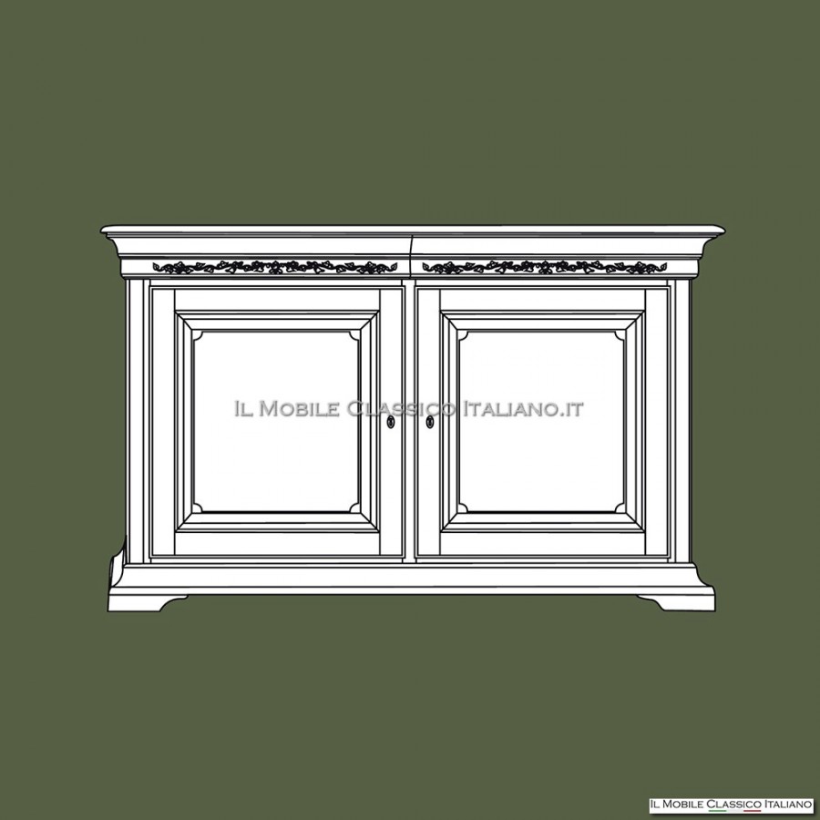 Le buffet se caractérise par la sculpture du motif Edera sur la corniche , qui ajoute une touche de raffinement au design du meuble. À l'intérieur du buffet, il y a deux portes avec des étagères qui offrent suffisamment d'espace pour placer des objets personnels tels que des assiettes, des verres ou d'autres articles ménagers très courants dans la cuisine ou la salle à manger. De plus, il y a aussi deux tiroirs secrets où vous pourrez ranger vos affaires en toute sécurité, cachés sur le rebord sous le plateau.