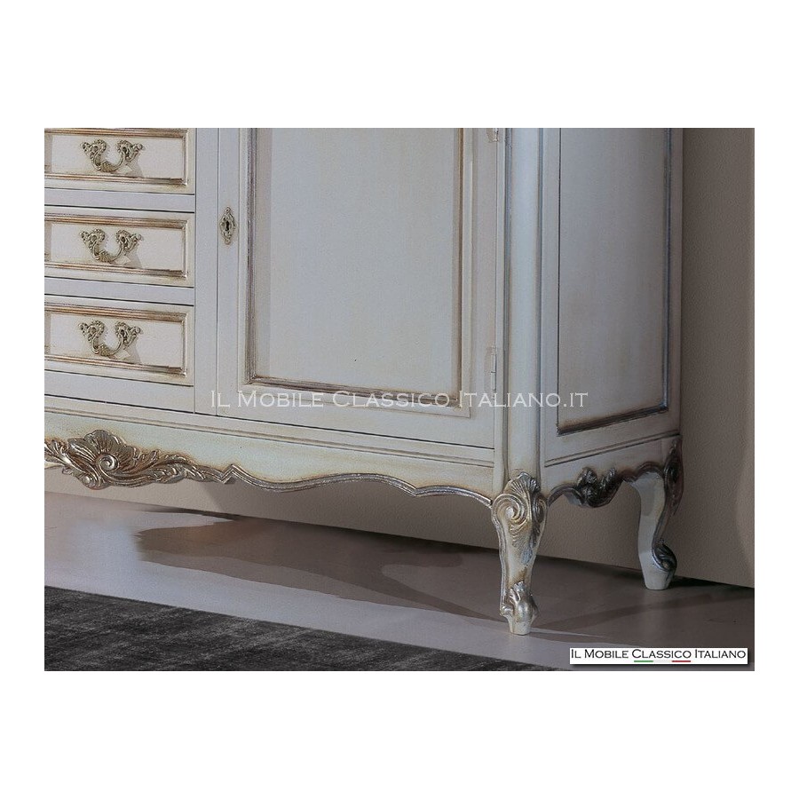 Le buffet style 700 est composé de 5 tiroirs centraux et 2 latéraux et de 2 portes avec une étagère intérieure réglable en hauteur. La structure est entièrement en bois massif et présente des sculptures sur les pieds et les profils qui, dans la couleur comme sur la photo, ont été rehaussées par la feuille d'argent. Le meuble buffet classique est capable de combiner parfaitement élégance et fonctionnalité dans une seule solution, le bon complément pour donner un aspect luxueux à votre maison.